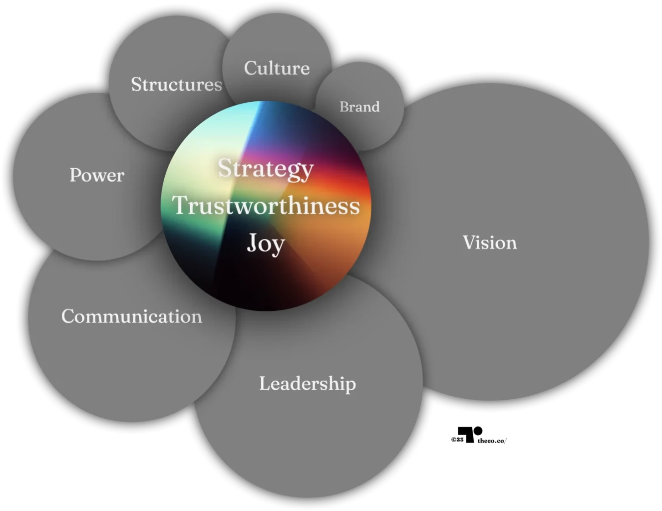 The image illustrates how strategy, trustworthiness, and joy sit at the heart of interconnected business elements like Culture, Leadership, Communication, Power, Structures, Brand, and Vision. Measuring and improving these metrics gives leaders a clear, systemic view of transformation unfolding across the organisation – moving beyond surveys of the past.